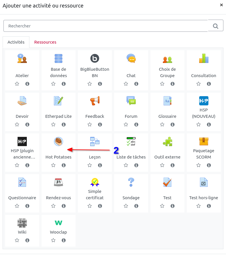 Cliquer sur ajouter une activité ou ressource puis choisir l’activité HotPotatoes