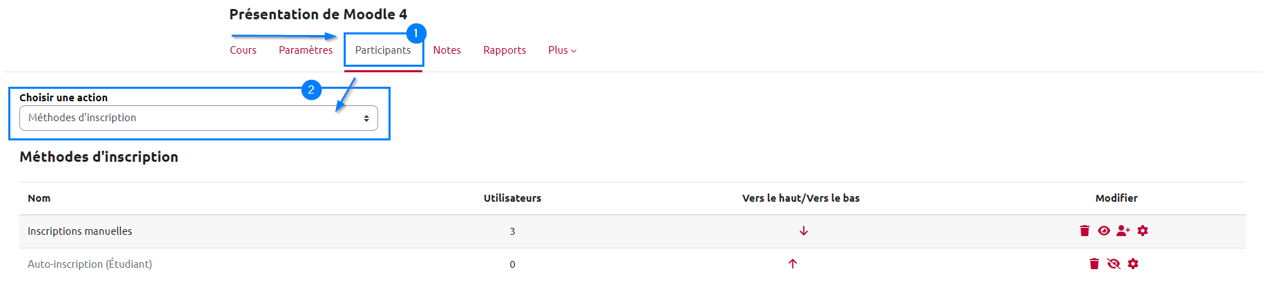 Pour connaître les méthodes d'inscription utilisées dans votre espace de cours, vous devez cliquer “Participants” puis sélectionner dans le menu déroulan “Méthodes d'inscription”.