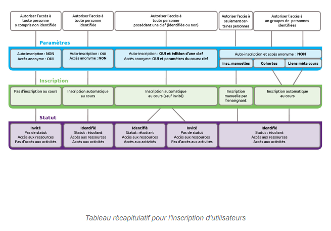 | Un ensemble d'usagers ne correspondant pas à une cohorte d'inscription administrative | Inscription des utilisateurs en lots dans UN espace de cours (avec un fichier .csv) ou renouveler des inscriptions de type "auto-inscription" ou "inscription manuelle" | |