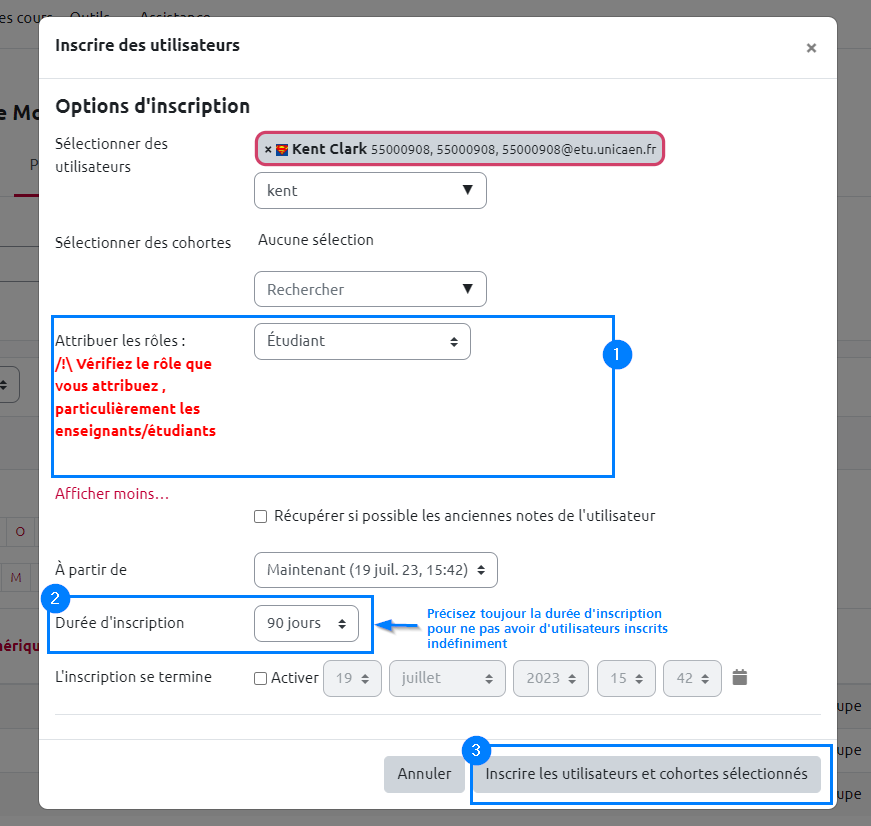 Cette méthode d'inscription permet d'inscrire très rapidement un ou plusieurs utilisateurs dans votre espace de cours en lui définissant son rôle dans l'espace ainsi qu'une durée d'inscription.