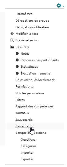 - Dans l'espace de cours de destination, cliquer sur le rouage puis sur “Restauration” :