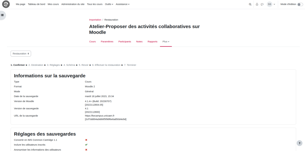 Pour restaurer un espace de cours, il faut disposer du fichier de sauvegarde (voir ci-dessus “Stockage des sauvegardes”).