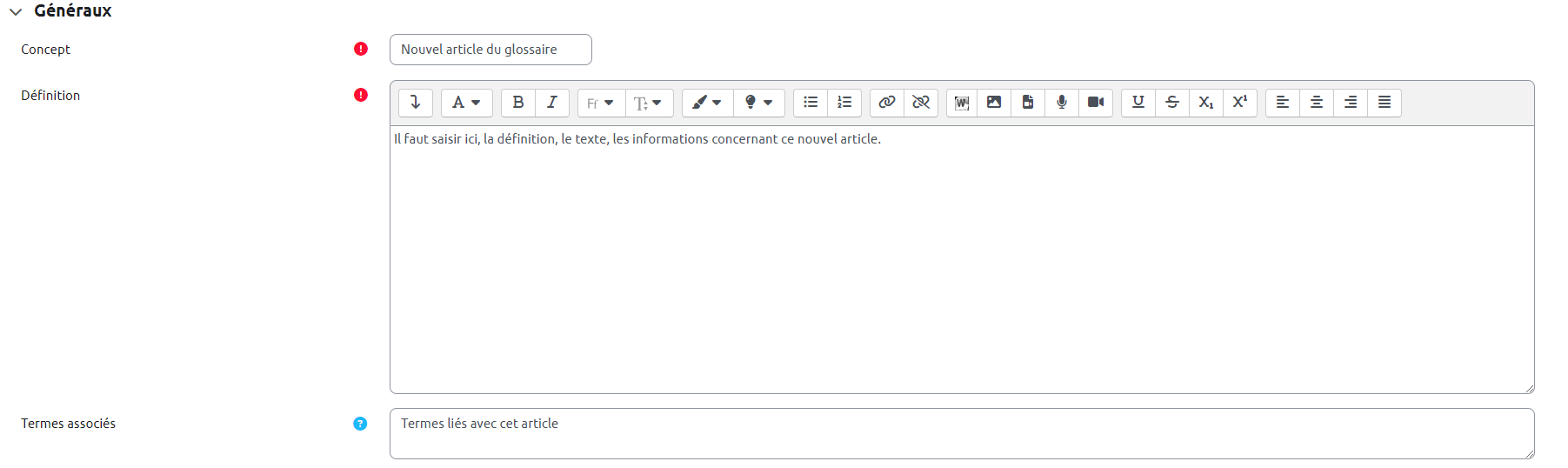 Si le filtre de liens automatiques des glossaires est activé, les articles des glossaires seront automatiquement liés lorsque les expressions définies apparaissent dans le cours.