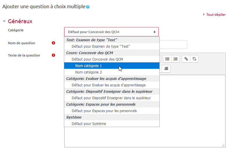 - Tout en haut de l'interface de création d'une question, vous pouvez choisir la catégorie dans laquelle vous souhaitez enregistrer la question :