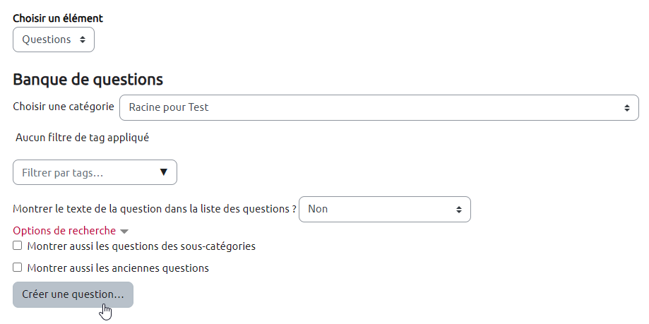 Accédez à la banque de questions et créez toutes vos catégories pour ensuite créer les questions en les enregistrer directement dans les bonnes catégories.