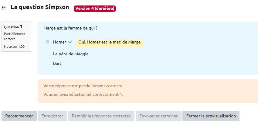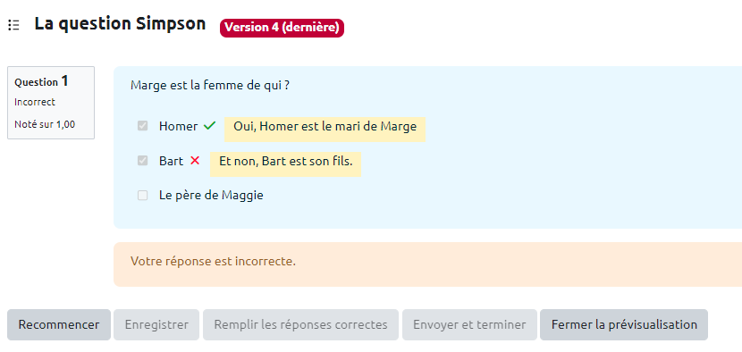 - Vous pouvez tester la question sur « Recommencer » autant que souhaité et sur « Remplir les réponses correctes » pour vérifier le comportement adéquat de la question. Cela vous permet de voir le rendu avec bonne ou mauvaise réponse en cliquant sur “Envoyer et terminer”: