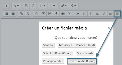 - une balise ouvrante : {POODLL:type=“tta”,speaker=“Male”,language=“English(GB)”,format=“text”}