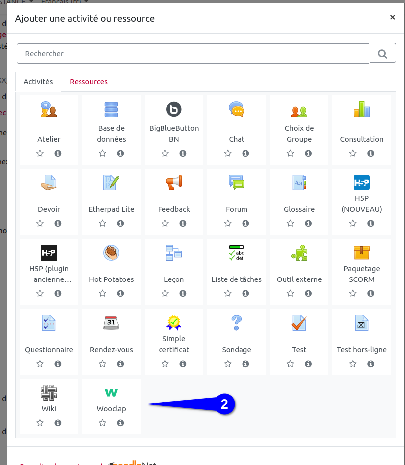 - Ensuite choisir l'activité Wooclap dans la liste des activités proposées