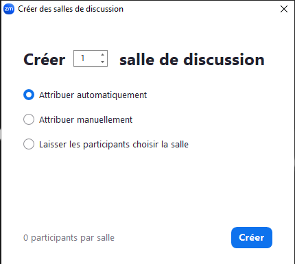 Si vous choisissez d'attribuer automatiquement, Zoom répartira automatiquement les participants dans les salles.